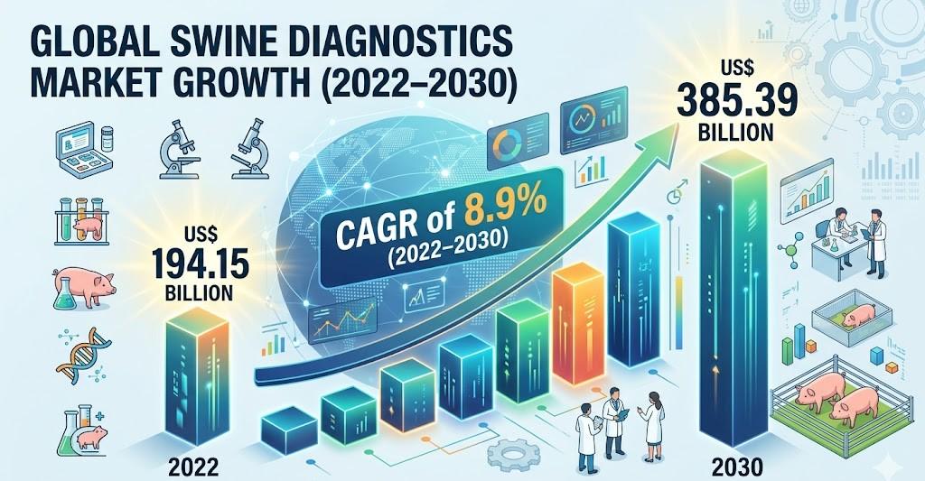 The global swine diagnostics industry is undergoing strong expansion, supported by rising livestock production, increasing disease prevalence, and growing demand for protein-rich food products. The global swine diagnostics sector was valued at approximately US$ 194.15 billion in 2022 and is projected to reach around US$ 385.39 billion by 2030, registering a CAGR of 8.9% during the forecast period. This robust growth reflects the increasing importance of early disease detection and advanced veterinary diagnostic technologies in commercial swine farming systems worldwide.