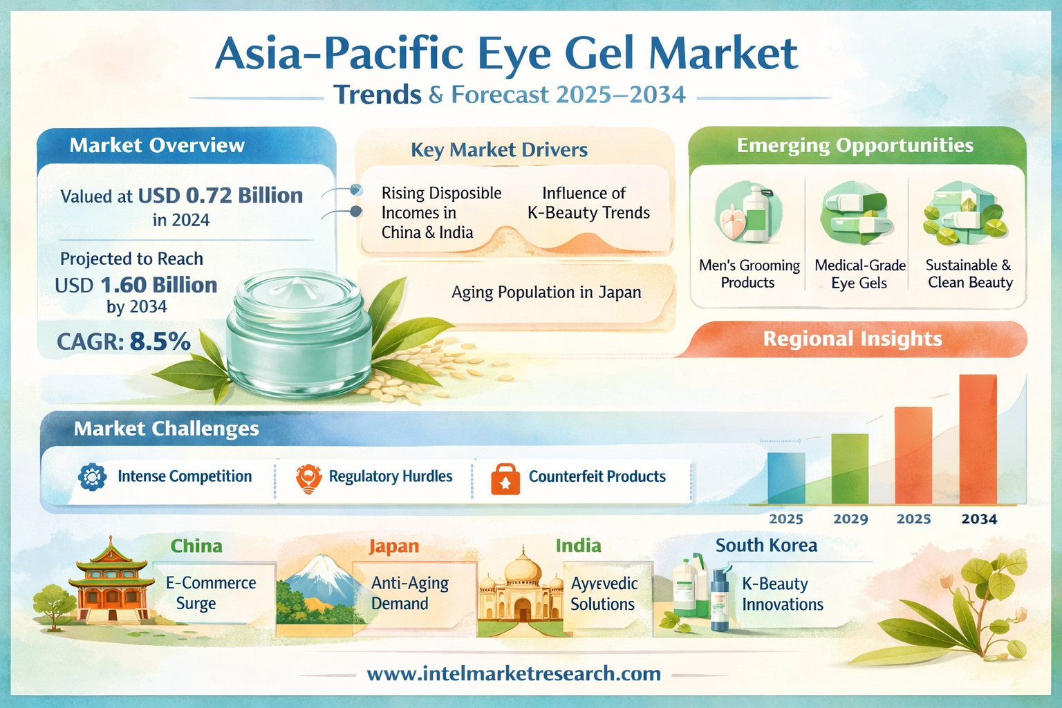 According to a new report from Intel Market Research, the Asia-Pacific Eye Gel Market was valued at USD 0.72 billion in 2024 and is projected to grow from USD 0.78 billion in 2025 to USD 1.60 billion by 2034, exhibiting a CAGR of 8.5% during the forecast period (2025–2034). This growth is propelled by surging disposable incomes in China and India, the influence of K-beauty trends emphasizing bright under-eyes, and Japan's aging population driving anti-aging demand.