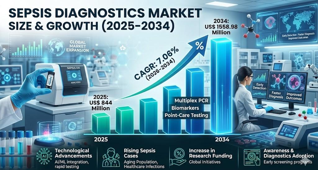 The Sepsis Diagnostics Market Overview indicates a strong growth trajectory, with the global valuation expected to rise from US$ 844 million in 2025 to US$ 1558.98 million by 2034, registering a CAGR of 7.06% during 2026–2034. This expansion is driven by advancements in molecular testing, increasing demand for point-of-care diagnostics, and the rising geriatric population that is more vulnerable to severe infections.