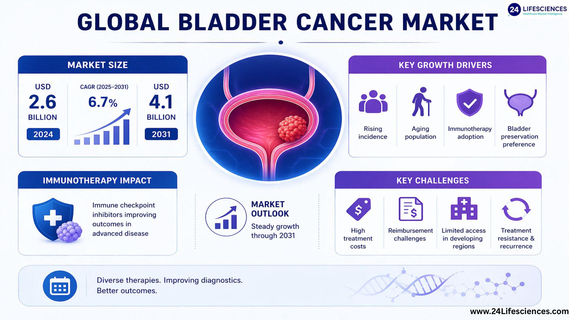 According to a newly published market research report by 24LifeSciences, global bladder cancer market was valued at USD 2.6 billion in 2024 and is projected to reach USD 4.1 billion by 2031, growing at a compound annual growth rate (CAGR) of 6.7% during the forecast period 2025-2031.