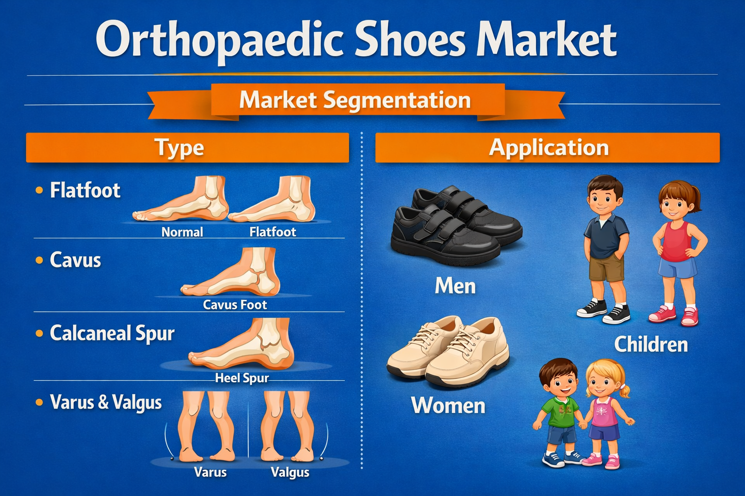 The orthopaedic shoes market is segmented based on type (flatfoot, cavus, calcaneal spur, varus and valgus) and application (men, women, and children). Geographically, the market spans North America, Europe, Asia-Pacific, Middle East & Africa, and South & Central America.