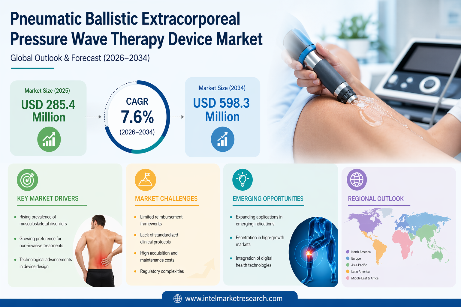 According to a new report from Intel Market Research, the global Pneumatic Ballistic Extracorporeal Pressure Wave Therapy Device market was valued at USD 285.4 million in 2025 and is projected to reach USD 598.3 million by 2034, growing at a CAGR of 7.6% during the forecast period (2026–2034). This growth is propelled by the rising global prevalence of musculoskeletal disorders, growing adoption of non-invasive physiotherapy modalities, and increasing healthcare expenditure across both developed and emerging economies.