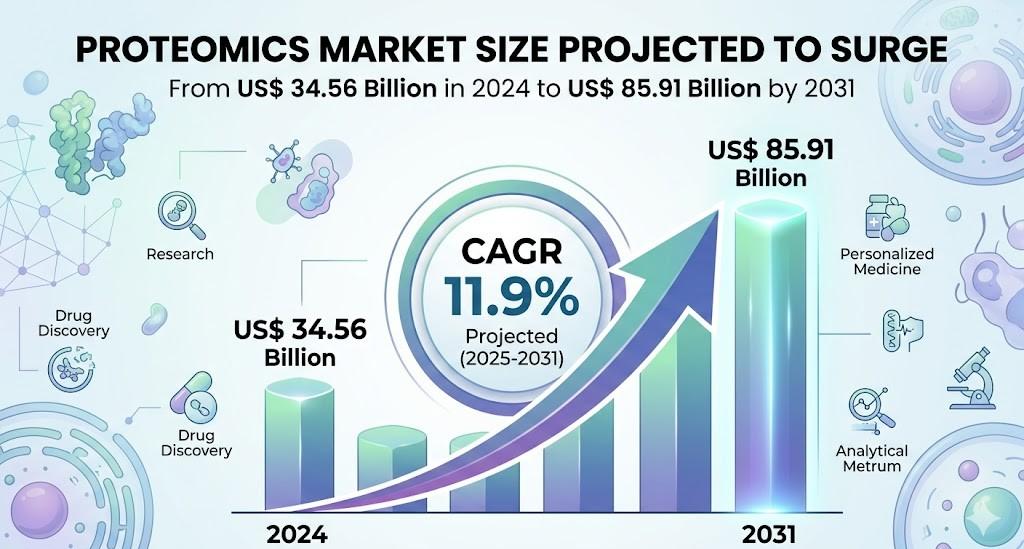 The Proteomics Market Size is projected to rise from US$ 34.56 billion in 2024 to US$ 85.91 billion by 2031, registering a CAGR of 11.9% during 2025 to 2031. This strong growth reflects rising demand for high precision analytical tools that help decode complex biological processes and support early disease detection and targeted therapy development.