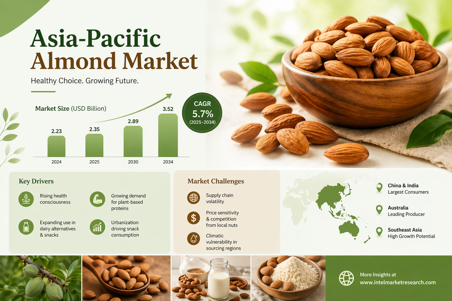 According to a new report from Intel Market Research, the Asia-Pacific Almond Market was valued at USD 2.23 billion in 2024 and is projected to grow from USD 2.35 billion in 2025 to USD 3.52 billion by 2034, exhibiting a CAGR of 5.7% during the forecast period (2025–2034). This growth is propelled by surging health consciousness, rising demand for plant-based proteins, urbanization driving snack consumption, expanding applications in dairy alternatives like almond milk, and festive foods.