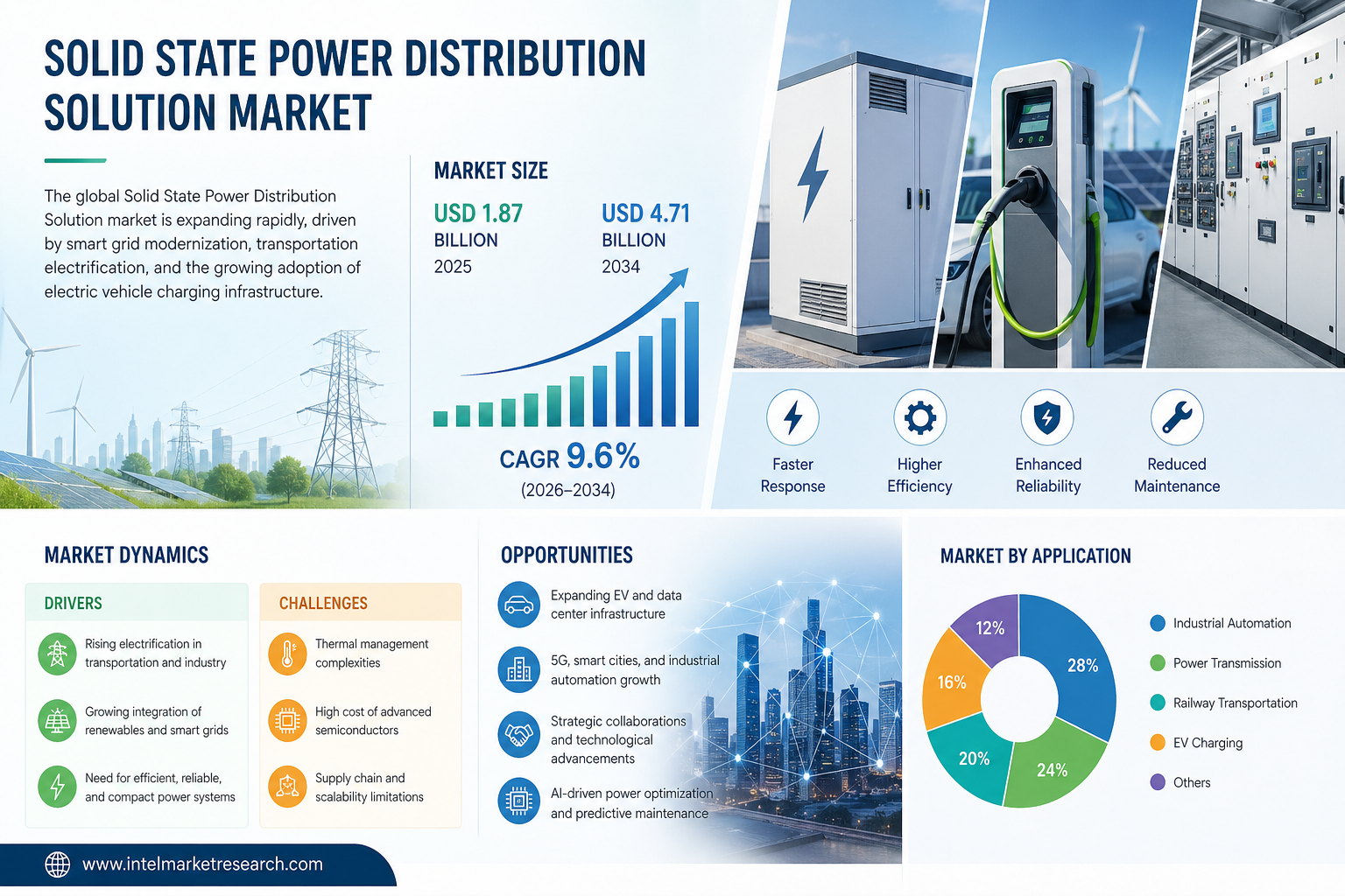 According to a new report from Intel Market Research, the global Solid State Power Distribution Solution market was valued at USD 1.87 billion in 2025 and is projected to reach USD 4.71 billion by 2034, growing at a robust CAGR of 9.6% during the forecast period (2026–2034). This growth is propelled by the rapid expansion of smart grid infrastructure, increasing electrification of transportation networks, and growing adoption of electric vehicle (EV) charging systems globally.