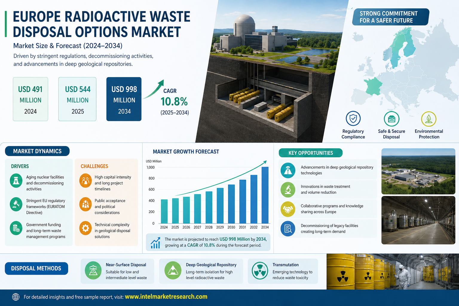 According to a new report from Intel Market Research, the Europe Radioactive Waste Disposal Options market was valued at USD 491 million in 2024 and is projected to grow from USD 544 million in 2025 to USD 998 million by 2034, growing at a robust CAGR of 10.8% during the forecast period (2025–2034). This growth is propelled by stringent EU regulatory frameworks under EURATOM, ongoing decommissioning of aging nuclear facilities, and advancements in deep geological repositories. Countries like France, Sweden, and Finland lead with progressive waste management programs, while initiatives by key players such as Posiva Oy, Orano, Veolia Environnement S.A., and Swedish Nuclear Fuel and Waste Management Company (SKB) are fueling progress.