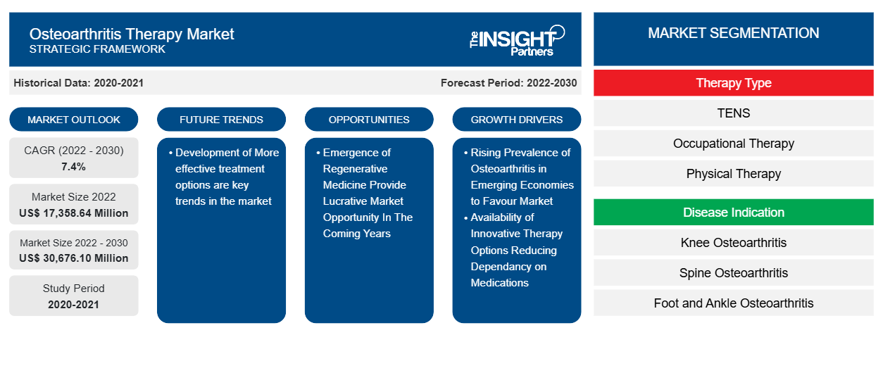 The global osteoarthritis therapy market is witnessing substantial growth due to the increasing prevalence of joint disorders, rising geriatric population, and growing demand for effective pain management solutions. Osteoarthritis is one of the most common chronic conditions affecting millions worldwide, leading to joint pain, stiffness, and reduced mobility. The rising burden of obesity and sedentary lifestyles is further contributing to the growing incidence of osteoarthritis, thereby increasing the demand for therapeutic interventions. The osteoarthritis therapy market size is projected to reach US$ 30,676.10 million by 2030 from US$ 17,358.64 million in 2022. The market is expected to register a CAGR of 7.4% during 2022–2030. Continuous advancements in pharmaceutical treatments and increasing focus on patient-centric care are supporting market expansion.
