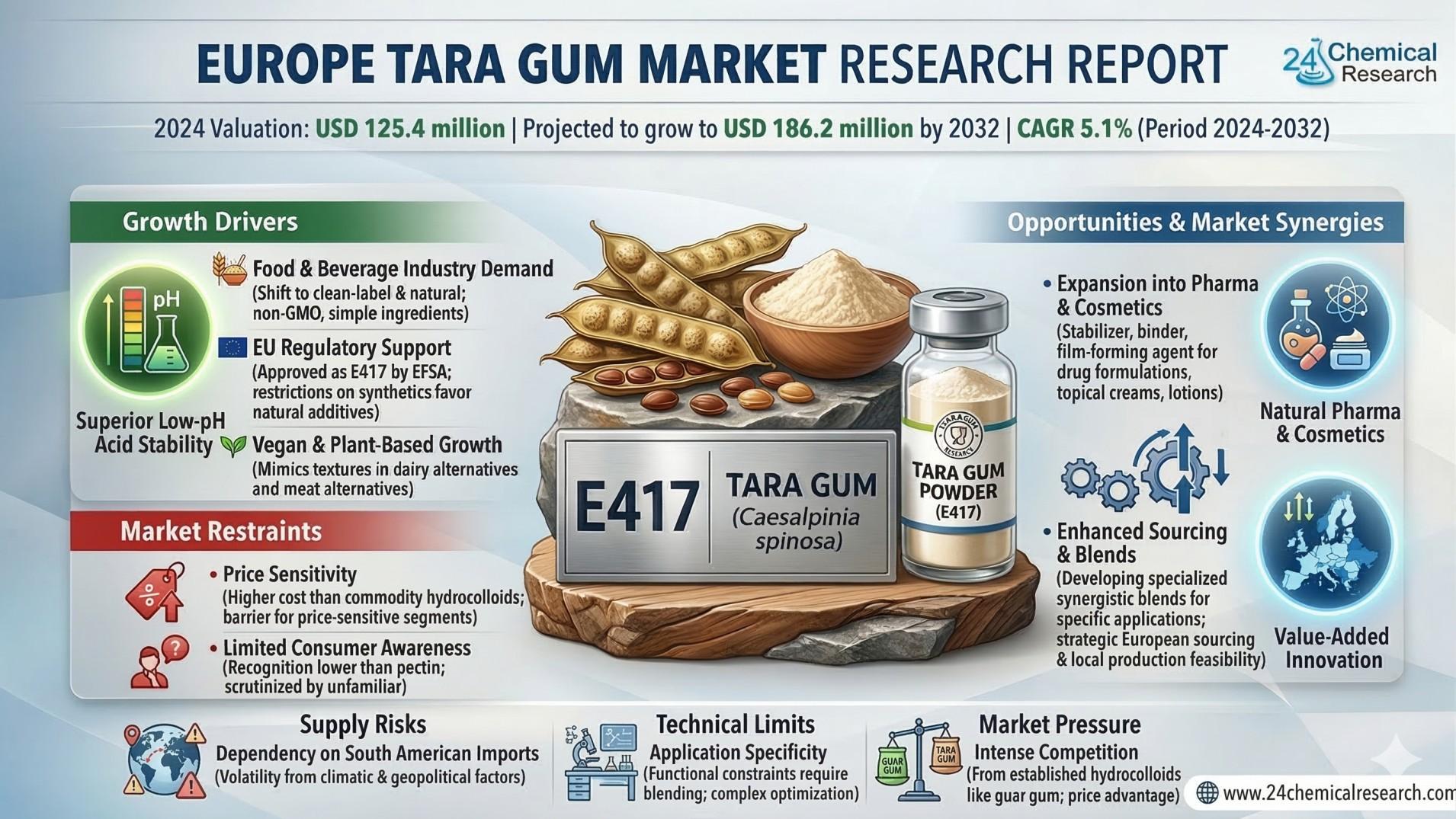 Europe Tara Gum market size was valued at USD 125.4 million in 2024. The market is projected to grow from USD 131.8 million in 2025 to USD 186.2 million by 2032, exhibiting a CAGR of 5.1% during the forecast period. This growth is primarily driven by increasing demand for natural food additives, clean-label ingredients, and sustainable thickening agents across food processing, personal care, and pet food industries.