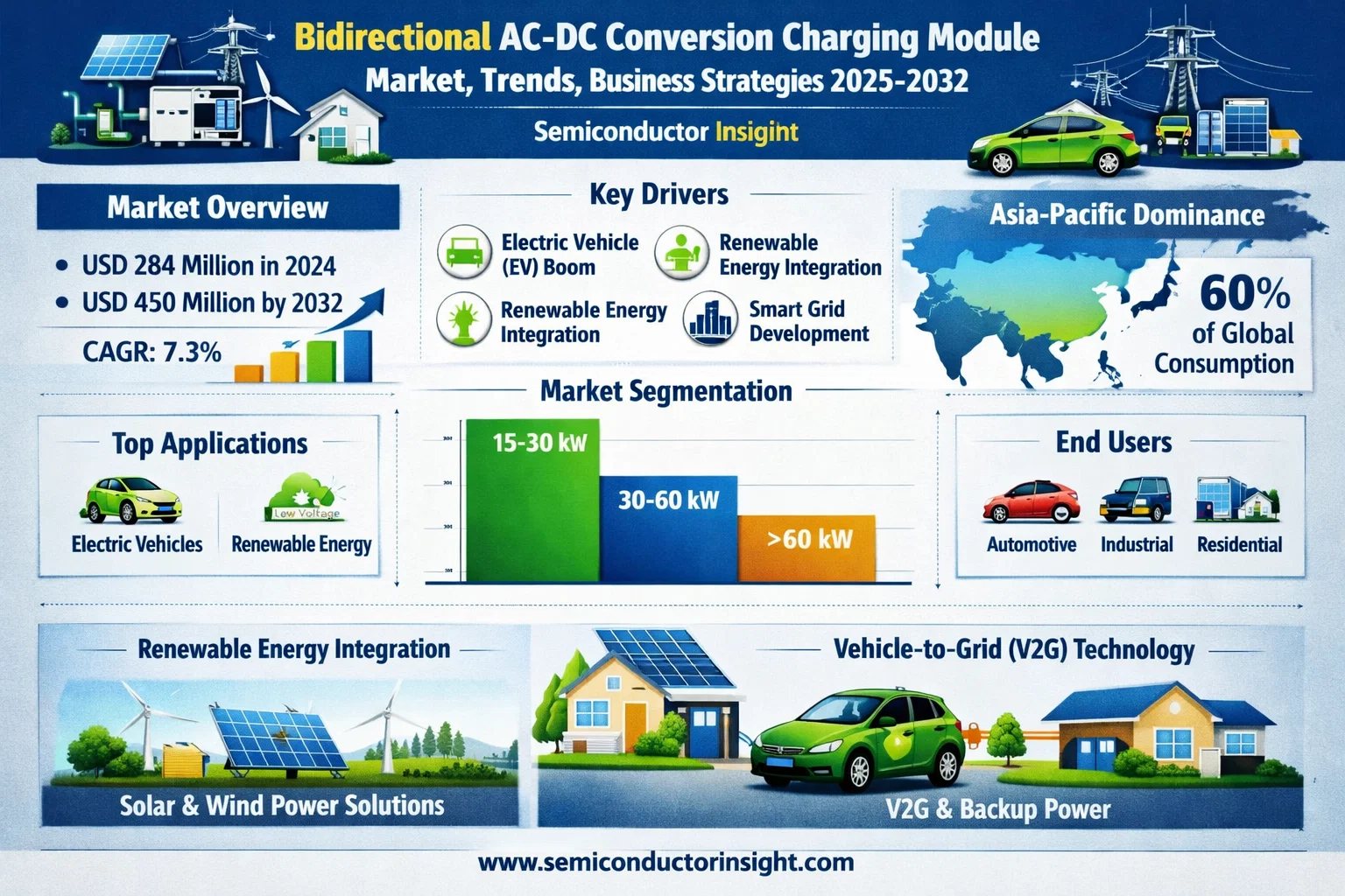 Global Bidirectional AC-DC Conversion Charging Module Market, valued at USD284 million in 2024, is poised for substantial growth, projected to reach USD 450 million by 2032. This expansion, driven by a compound annual growth rate (CAGR) of 7.3%, is detailed in a comprehensive new report published by Semiconductor Insight. The study underscores the pivotal role of these advanced power conversion systems in enabling energy flexibility and grid stability across electric vehicle infrastructure, renewable energy integration, and smart grid applications.