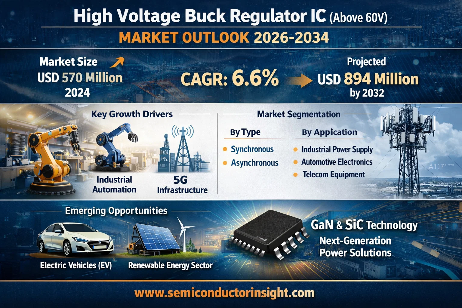 Global High Voltage Buck Regulator IC (Above 60V) Market, valued at a robust USD570 million in 2024, is on a trajectory of steady expansion, projected to reach USD894 million by 2032. This growth, representing a compound annual growth rate (CAGR) of 6.6%, is detailed in a comprehensive new report published by Semiconductor Insight. The study highlights the critical role of these specialized power management components in enabling efficient voltage regulation across demanding industrial, automotive, and telecommunications applications.