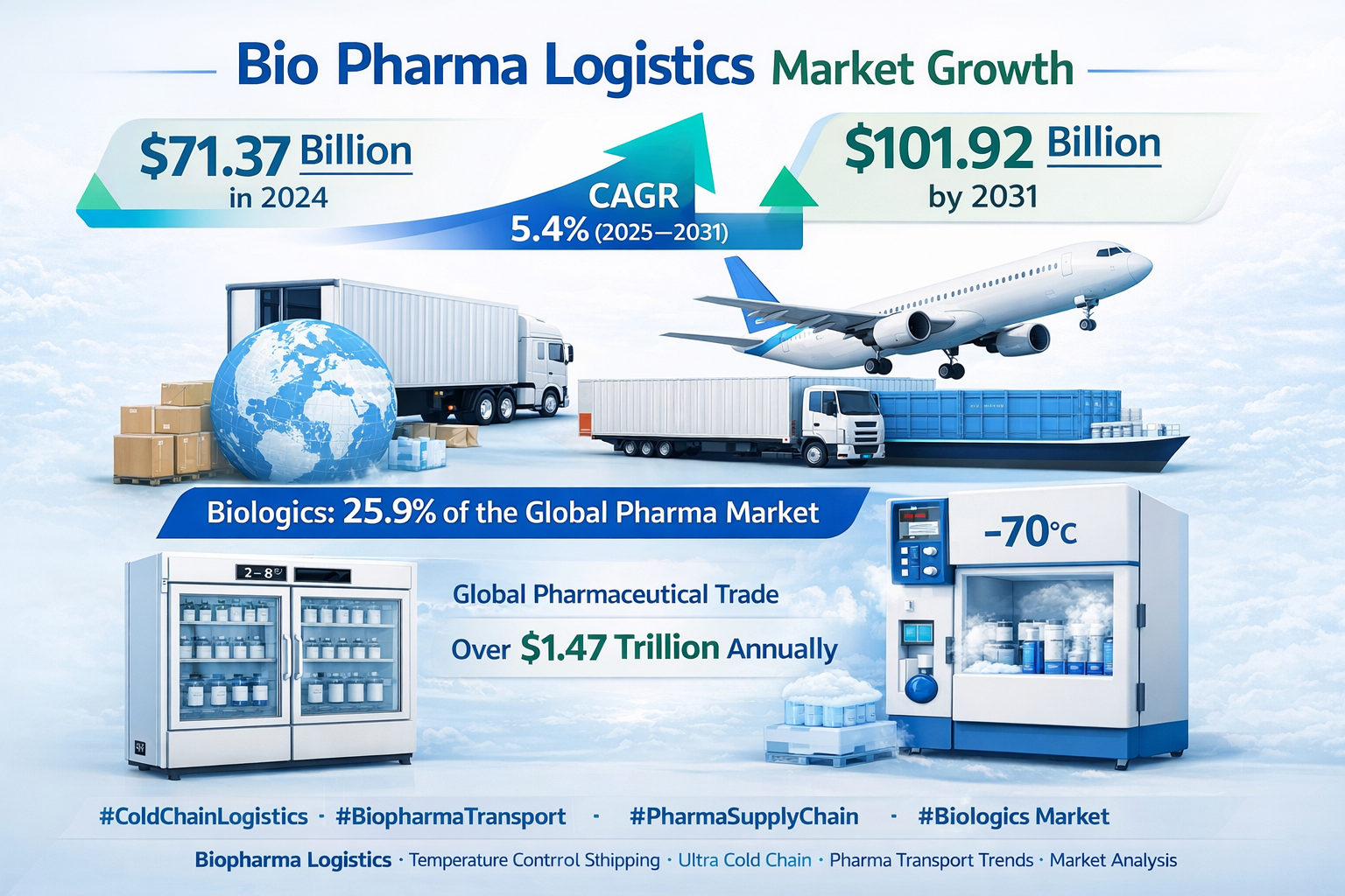 Bio Pharma Logistics represents the specialized handling and transportation of temperature-sensitive pharmaceutical products, particularly biologics which require strict temperature controls (ranging from 2-8C for refrigerated products to -70C for ultra-cold therapies). The sector has gained critical importance as biologics now account for 25.9% of the total pharmaceutical market, with global pharmaceutical trade exceeding USD 1.47 trillion annually.
